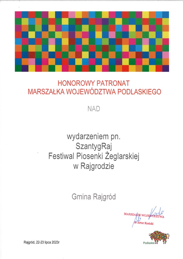 SzantygRaj Festiwal Piosenki Żeglarskiej w Rajgrodzie otrzymał Honorowy Patronat Marszałka Województwa Podlaskiego.