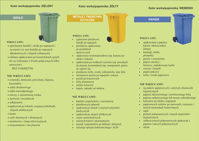 Przedstawiamy skrócony poradnik dotyczący segregacji śmieci. UWAGA!!! – Odpady komunalne z zabudowy mieszkaniowej i zabudowy letniskowej odbierane są wyłącznie w workach.