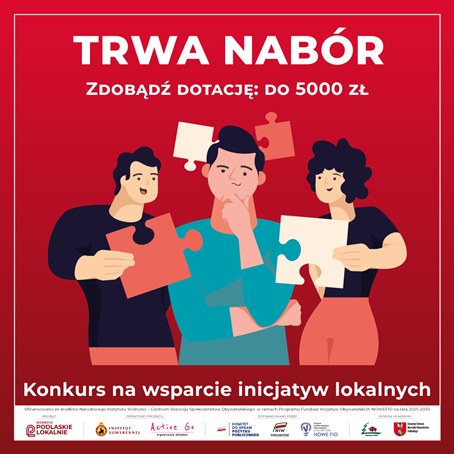 Już wkrótce rozpocznie się nabór na mikrodotacje, dzięki któremu zrealizujesz swoją inicjatywę! Operatorzy projektu Podlaskie Lokalnie – Fundacja Instytut Suwerennej oraz Spółdzielnia Socjalna „Active Go” w Białymstoku zachęcają do składania wniosków mikrodotacyjnych w ramach Konkursu na Wsparcie Inicjatyw Lokalnych.