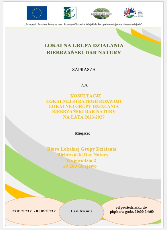 W związku z powyższym zapraszamy do konsultacji społecznych projektu Lokalnej Strategii Rozwoju na lata 2023-2027, który dostępny jest w biurze LGD Biebrzański Dar Natury.