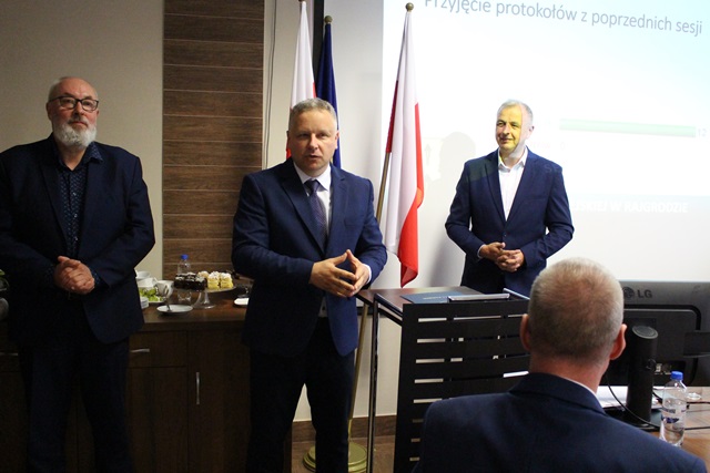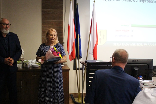 W trakcie obrad Burmistrz Rajgrodu Ireneusz Gliniecki wręczył pamiątkowy grawerton wraz z podziękowaniami za dotychczasową współpracę Dyrektor Szkoły Podstawowej w Rydzewie Joannie Maszczyk, która zakończyła kadencję dyrektora szkoły na terenie gminy Rajgród. Do życzeń i podziękowań dołączyli Przewodniczący Rady Miejskiej Marek Bućko, Wiceprzewodnicząca RM Magdalena Gryczan, Sekretarz Gminy Piotr Milewski oraz Skarbnik Gminy Joanna Andruk.