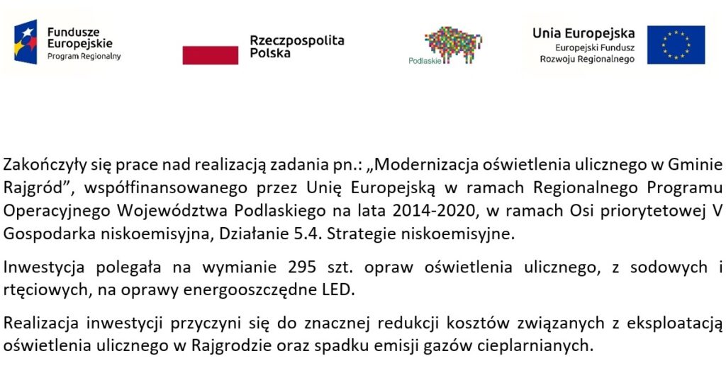 Zakończyły się prace nad realizacją zadania pn.: „Modernizacja oświetlenia ulicznego w Gminie Rajgród”, współfinansowanego przez Unię Europejską w ramach Regionalnego Programu Operacyjnego Województwa Podlaskiego na lata 2014-2020