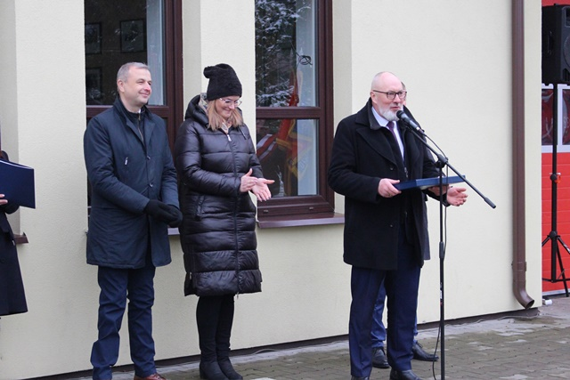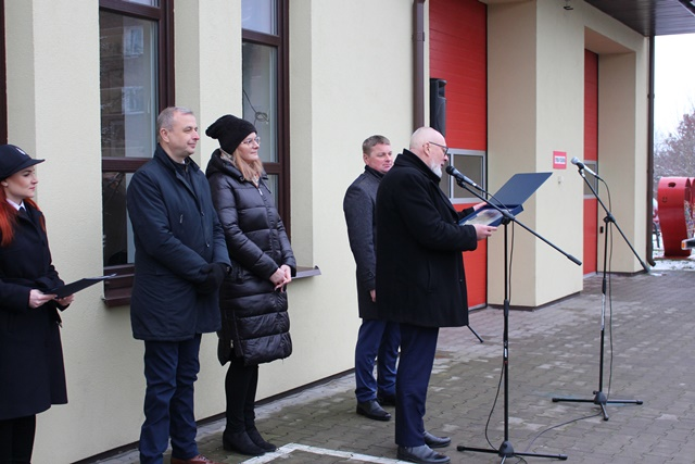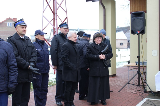 o pozyskanym wozie strażackim. Następnie Burmistrz Rajgrodu Ireneusz Gliniecki powitał zaproszonych gości, po czym nastąpiło poświęcenie samochodu pożarniczego. Poświęcenia dokonał Ks. Dziekan Hieronim Mojżuk Proboszcz parafii pw. Narodzenia NMP w Rajgrodzie.