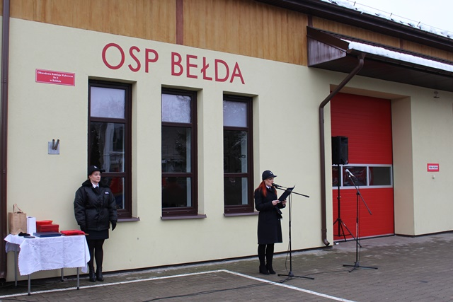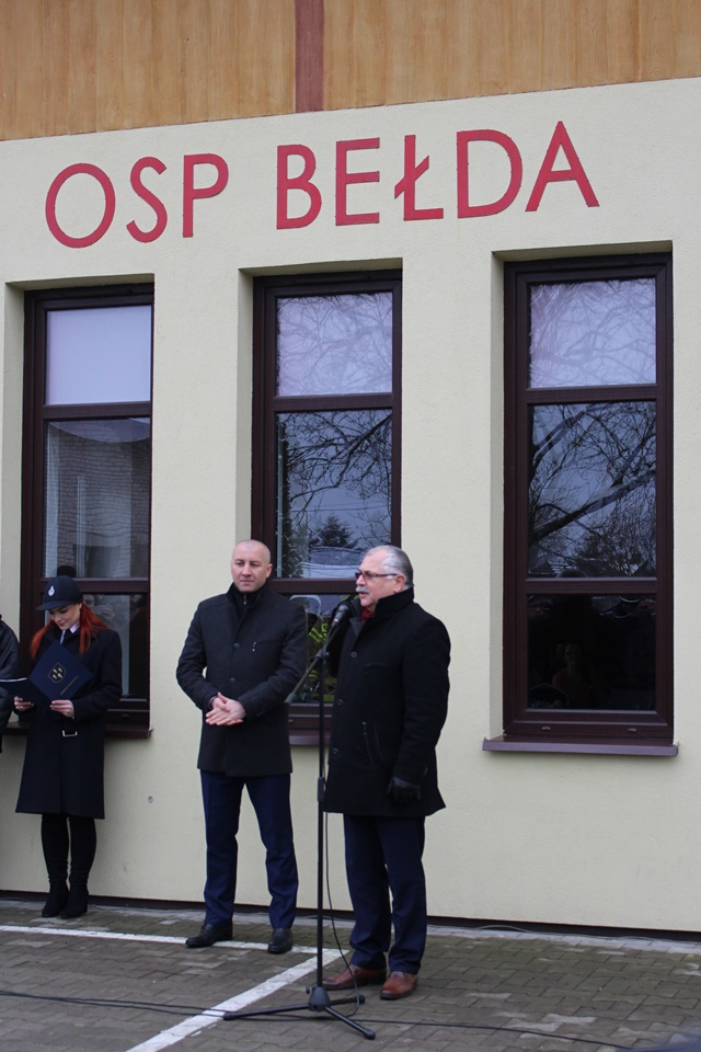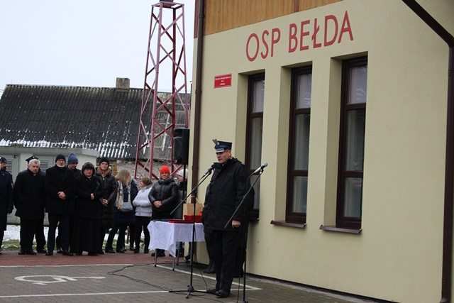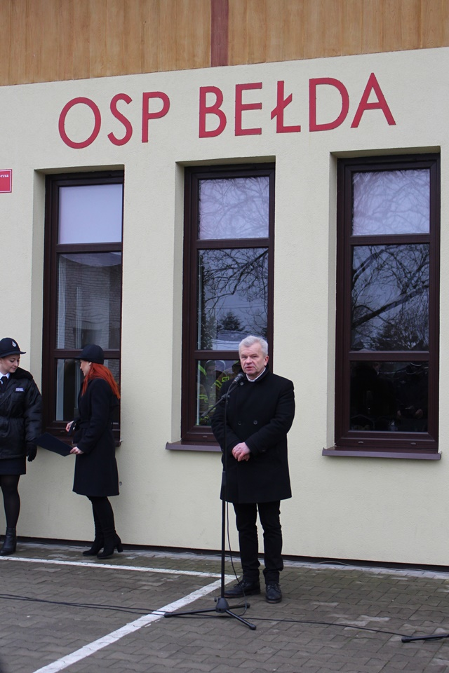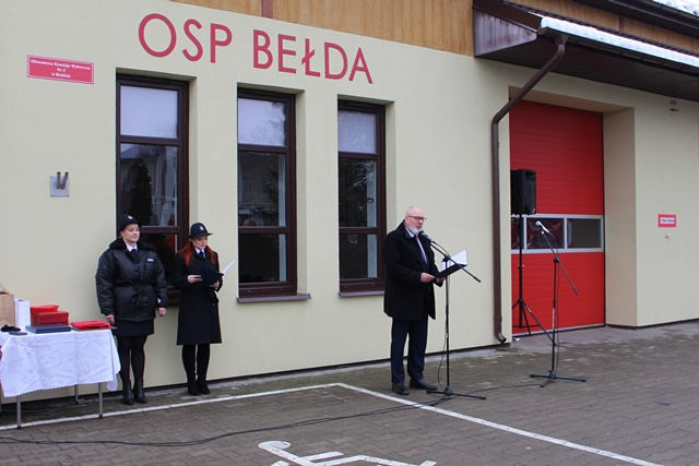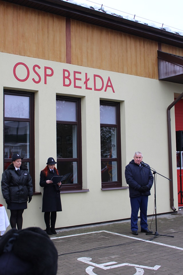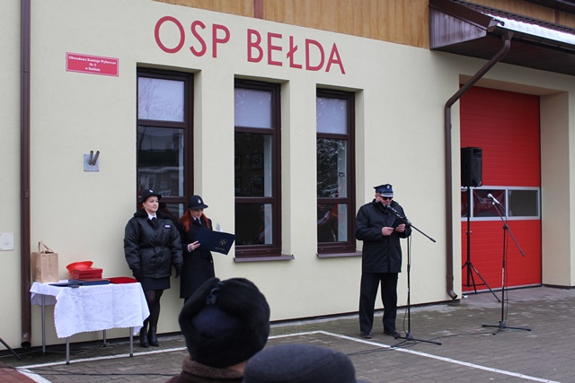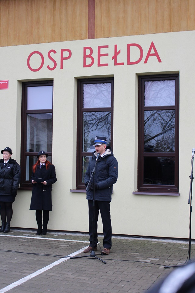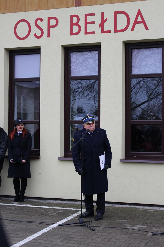 Uroczystość na placu przy remizie Ochotniczej Straży Pożarnej w Bełdzie rozpoczęła się od złożenia meldunku przez Dowódcę Uroczystości druha Łukasza Zawistowskiego Podlaskiemu Komendantowi Wojewódzkiemu Państwowej Straży Pożarnej starszemu brygadierowi Sebastianowi Zdanowiczowi. Prowadząca ceremonię druhna Marta Kuczyńska powitała zebranych gości oraz przedstawiła krótką informację