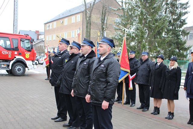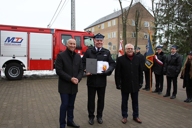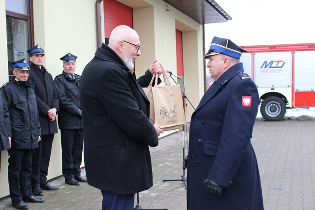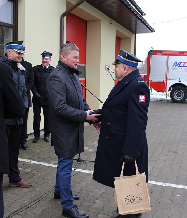 Kluczyki do nowego wozu oraz dowód rejestracyjny wręczyli Podlaski Komendant Wojewódzki Państwowej Straży Pożarnej starszy brygadier Sebastian Zdanowicz, Komendant Powiatowy Państwowej Straży Pożarnej w Grajewie młodszy brygadier Andrzej Beczko, Burmistrz Rajgrodu Ireneusz Gliniecki oraz Przewodniczący Rady Miejskiej w Rajgrodzie Marek Bućko.