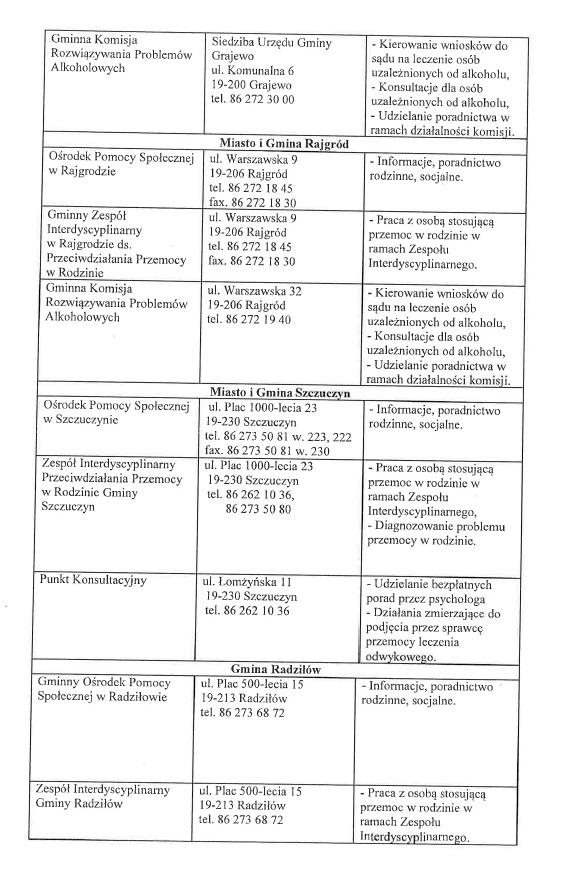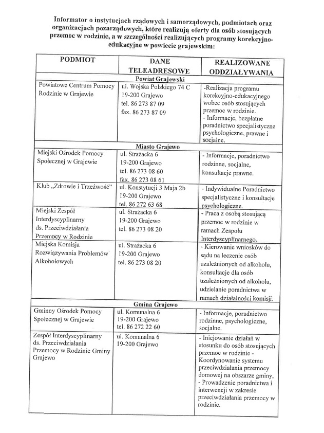 Informator o instytucjach rządowych i samorządowych, podmiotach oraz organizacjach pozarządowych, które realizują oferty dla osób stosujących przemoc w rodzinie, a w szczególności rezlizujących programy korekcyjno – edukacyjne w powiecie grajewskim.