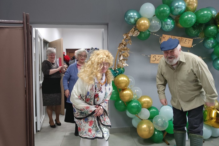 Po przywitaniu przez Helenkę przybyłych gości, rozpoczęliśmy występ śpiewem „Hymnu Emerytów”, będącego parafrazą pieśni „Jak długo na Wawelu bije Zygmunta dzwon”. I wreszcie przyszedł czas na prześmiewcze żarty z niektórych programów TV. Nasza niezastąpiona Królowa Tekstów, Irena, za kanwę krzywego zwierciadła, obrała takie programy, jak: „Rolnik szuka żony ”, „Kuchenne rewolucje” „Sanatorium miłości”, „Twoja twarz brzmi znajomo”, czy „The voice of senior”. Już samo wejście kolegi Leona – przez nas zwanego Dużym, w odróżnieniu od drugiego, grającego na akordeonie, nazywanego Małym – wywołało salwę śmiechu. W gumiakach, w koszulinie i czapce na głowie, wydzwaniający po sąsiadach w poszukiwaniu żony, rozbawił publiczność do łez.