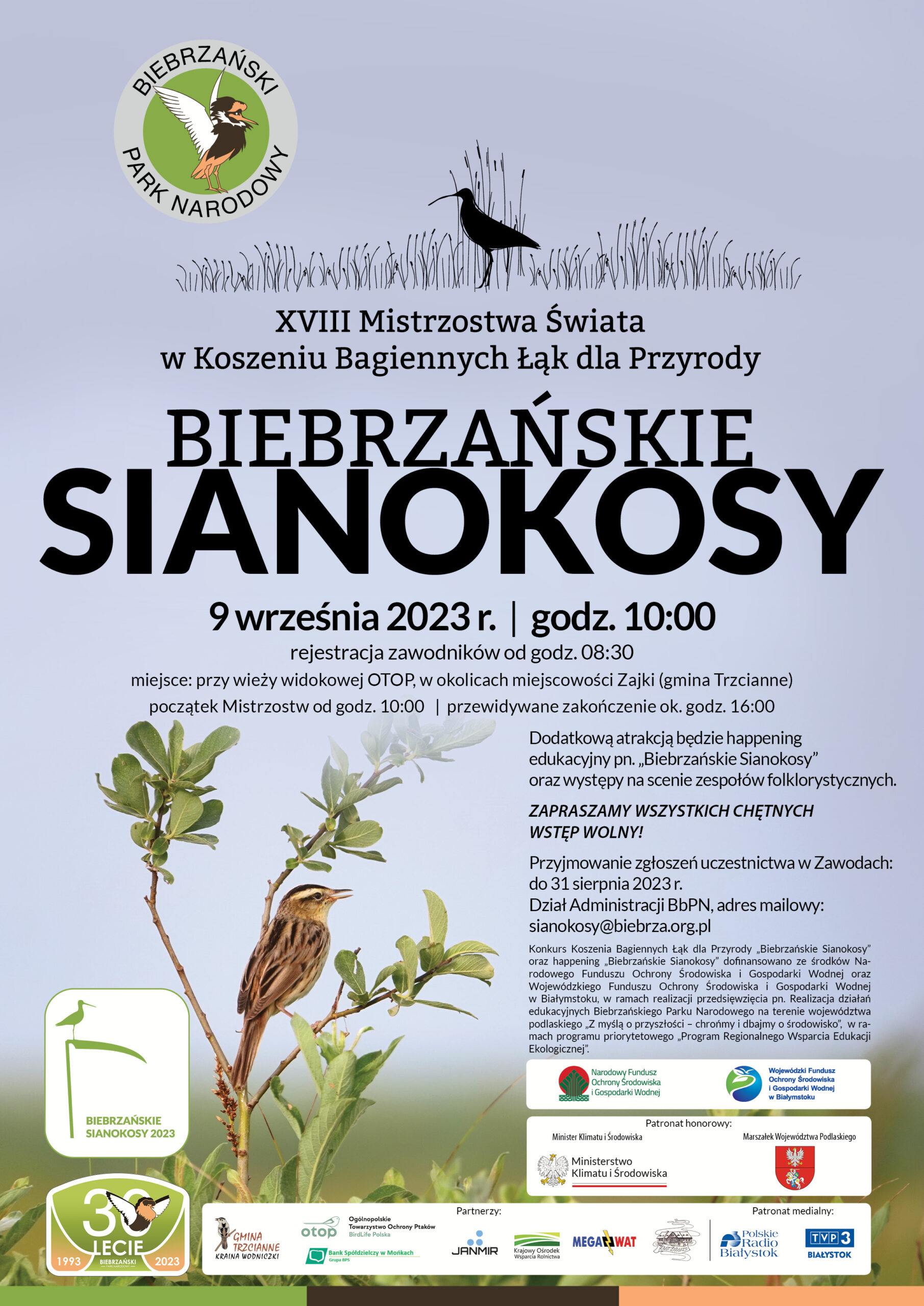 Biebrzański Park Narodowy w dniu 9 września 2023 r. organizuje Mistrzostwa Świata w Koszeniu Bagiennych Łąk dla Przyrody „Biebrzańskie Sianokosy”.