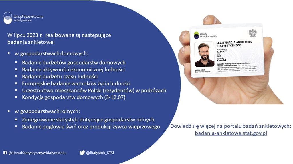 Od 1 czerwca do 14 sierpnia 2023 r. na terenie całego kraju odbywają się ważne dla polskiego rolnictwa badania statystyczne: zintegrowane statystyki dotyczące gospodarstw rolnych i badanie pogłowia świń oraz produkcji żywca wieprzowego. Obowiązek udziału w nich mają wylosowane gospodarstwa rolne. Jeśli rolnik nie wypełnił do 16 czerwca formularza przez Internet, skontaktuje się z nim ankieter (telefonicznie lub osobiście) w celu przeprowadzenia wywiadu.